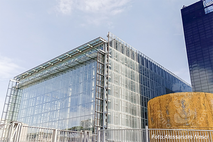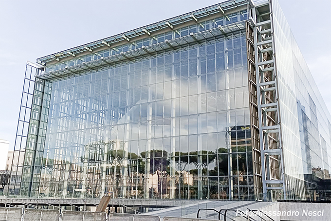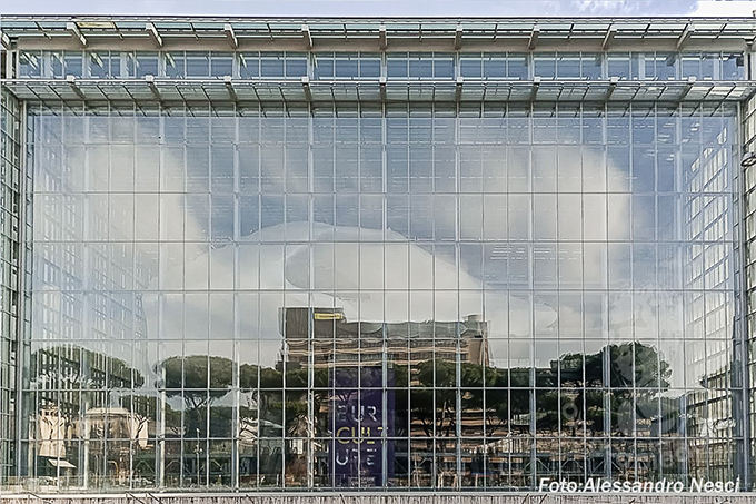 かつてE42と呼ばれたファシズム時代に生まれたエウル地区は1930年代から40年代のイタリア合理主義建築が並んでいます。その流れを受け継ぐかのような四角い「箱」に未来につなげる幾何学から切り離された自由な形である「雲」が収まる設計となっています。
