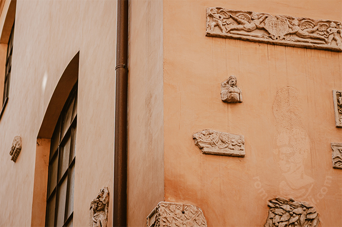 コルソ通りとリペッタ通りをつなぐアントニオ・カノーヴァ通りの小径を歩いていると壁に彫刻の断片が埋め込まれた建物に出会います。角を曲がるとそちらも彫刻がちりばめられています。
