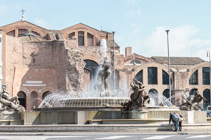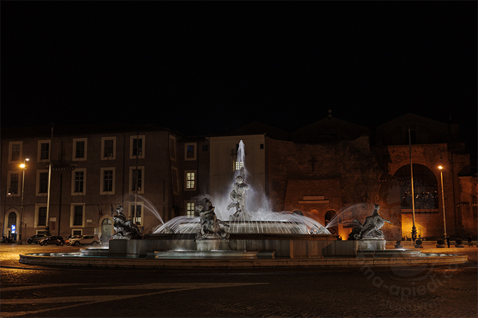 中央にある大きな噴水はナイアディの噴水で1900年代初期のもの。ローマにしては新しい噴水といえます。夜の噴水もとても美しいです。彫刻家、マリオ・ルテッリ作です。当初の計画の彫像とは異なるものが現在の彫像です。