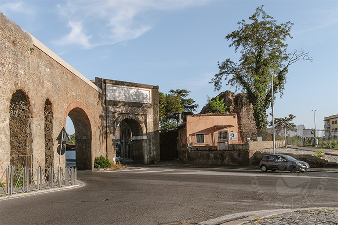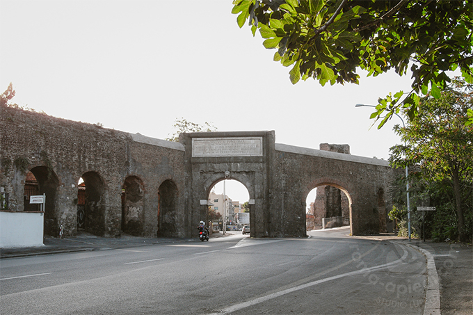 ローマの南の幹線道路トゥスコラーナ通りが通る門ということですが、思ったよりひっそりと建っています。ペペリーノという灰色のコッリ・アルバーニ地方でよく採れる石の門に大理石に刻まれた碑文を戴いています。入る角度が異なるレンガ組積の連続したアーチが両側につながっています。これはこの界隈を縦断しているフェリーチェ水道です。