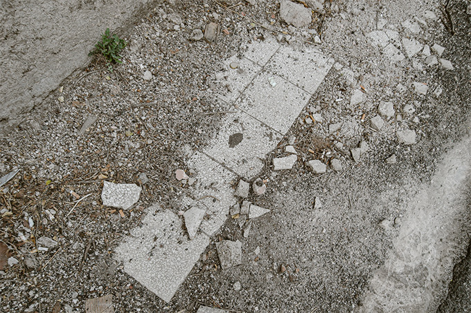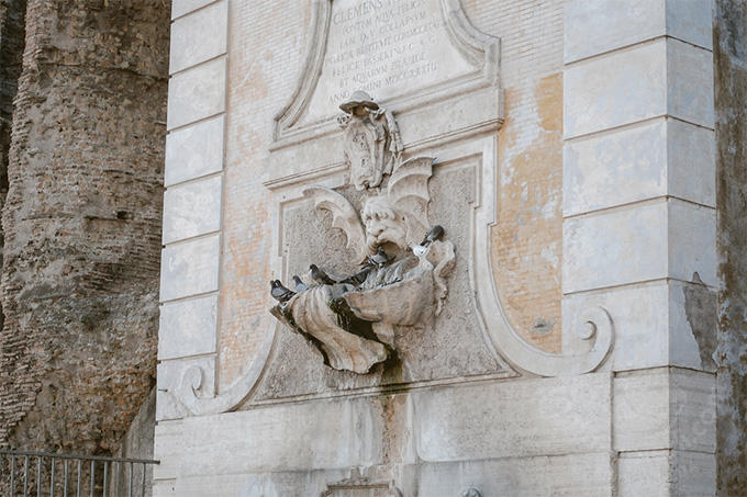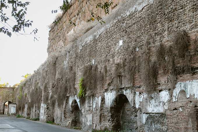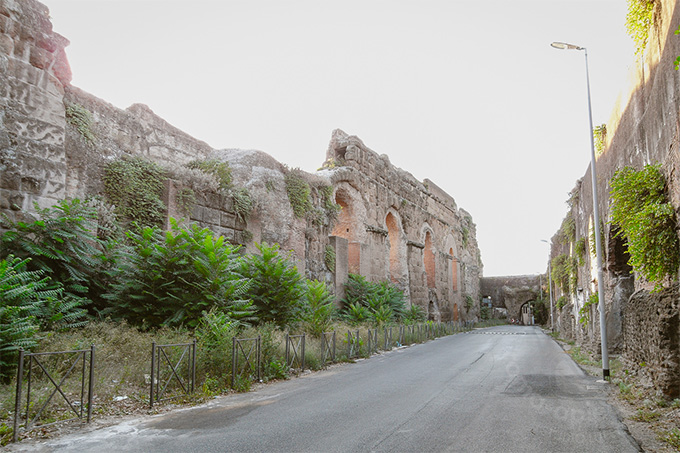 クレメンス12世の泉の横を走るマンドリオーネ通り沿いにはフェリーチェ水道がローマの中心に向かって走っています。かつて、アーチの下は住まいとして占拠されていた時代があったようで、壁らしき跡と床にはタイルが残っています。